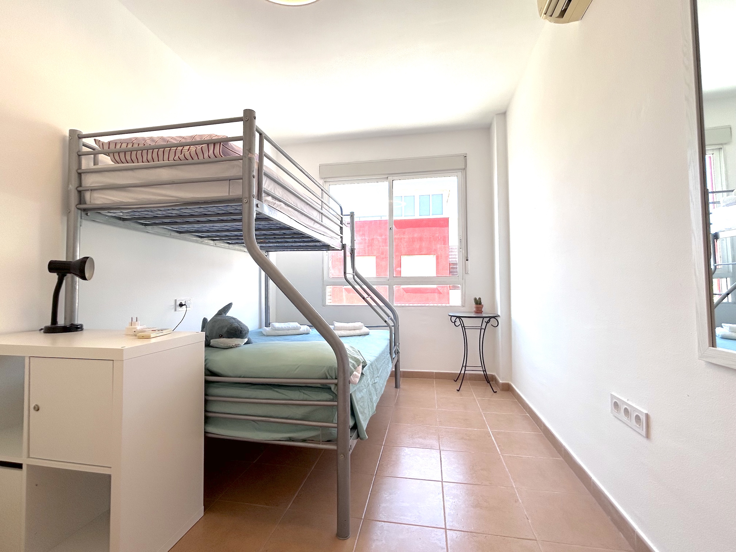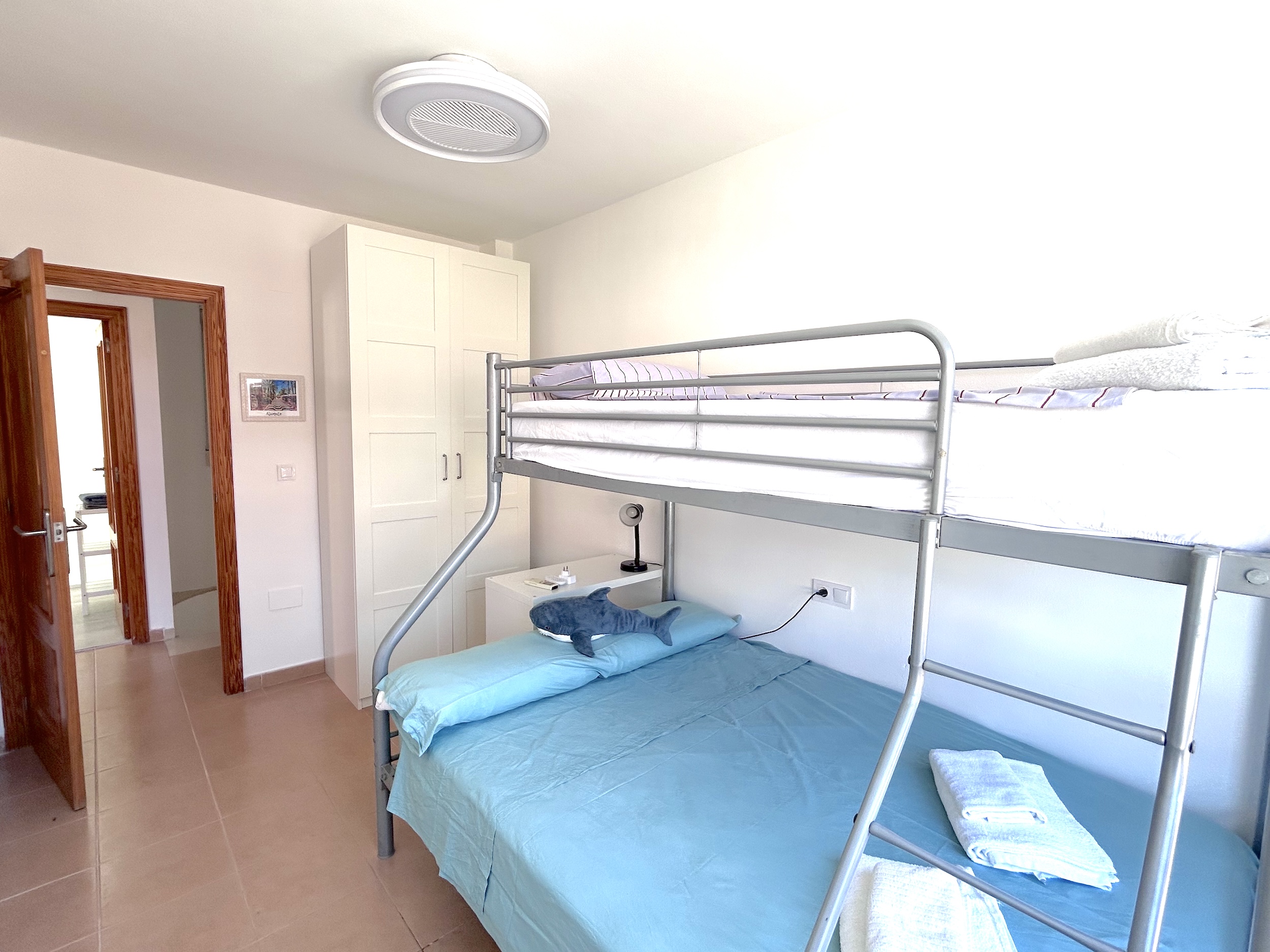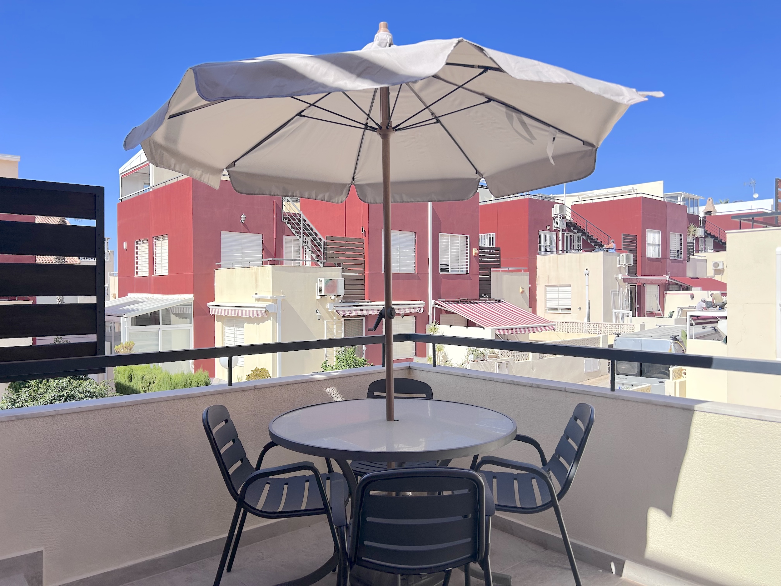 The first floor has the main bathroom with large walk in shower, guest bedroom with bunk beds and the mater bedroom with a king size bed. Both bedrooms have hot and cold air conditioning. The landing also provides access to a balcony with sun loungers and a table and chairs. From here you can also have access to the large private solarium where there is a garden set and more sun loungers.