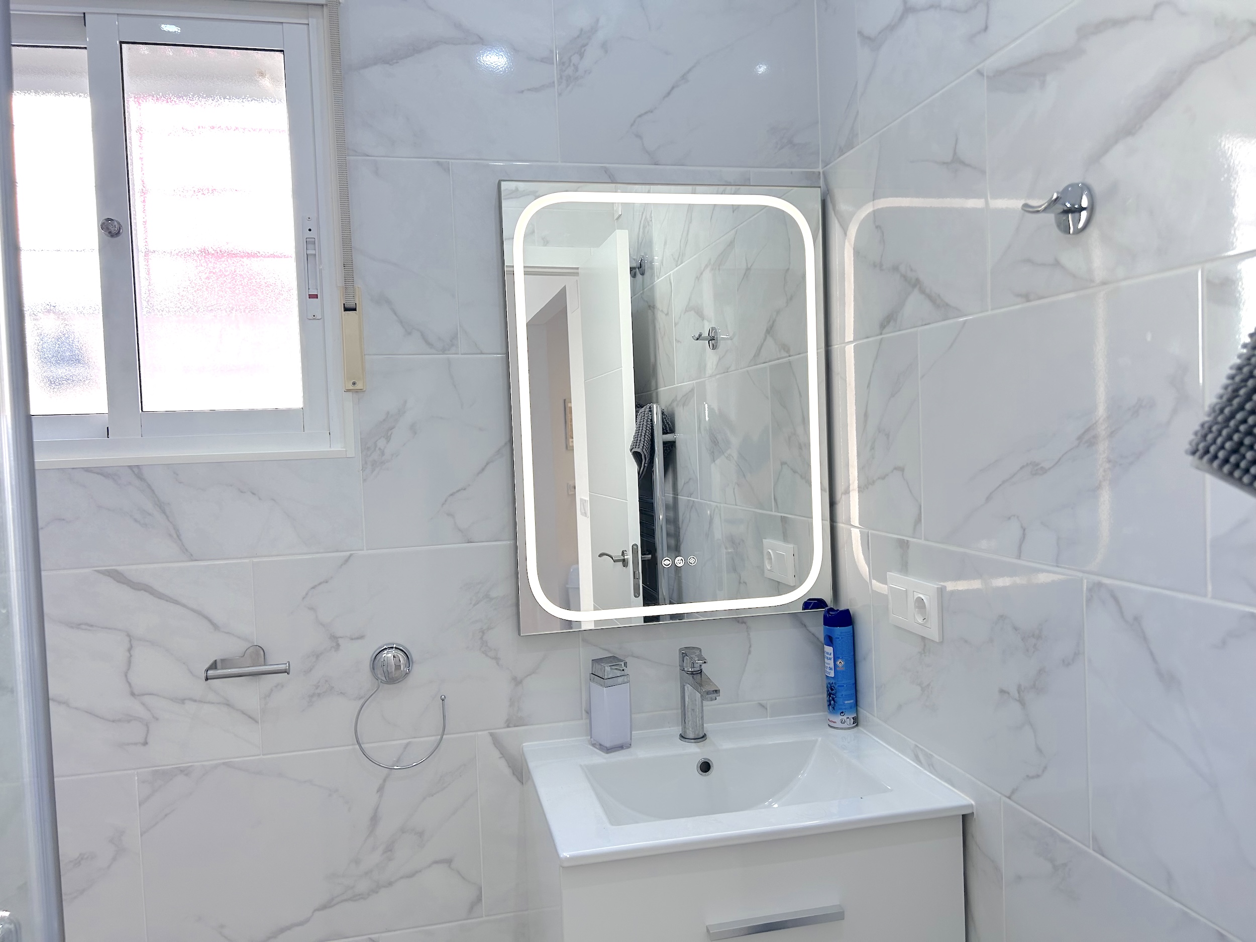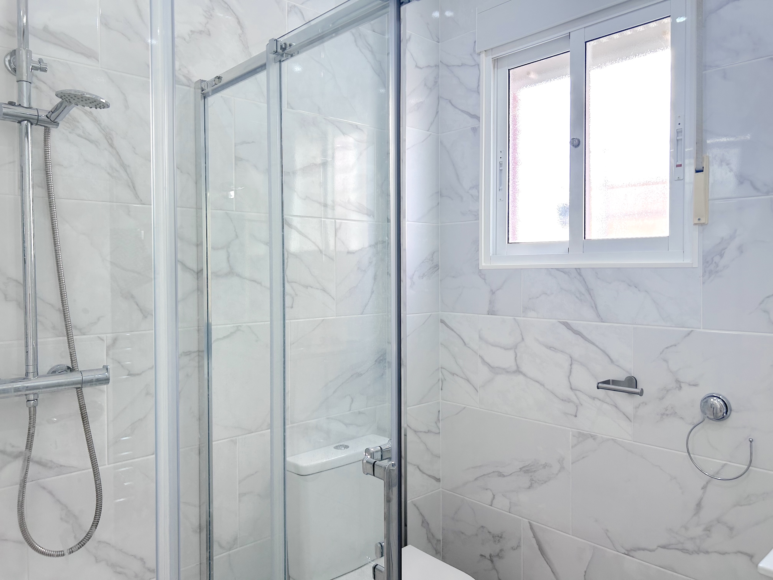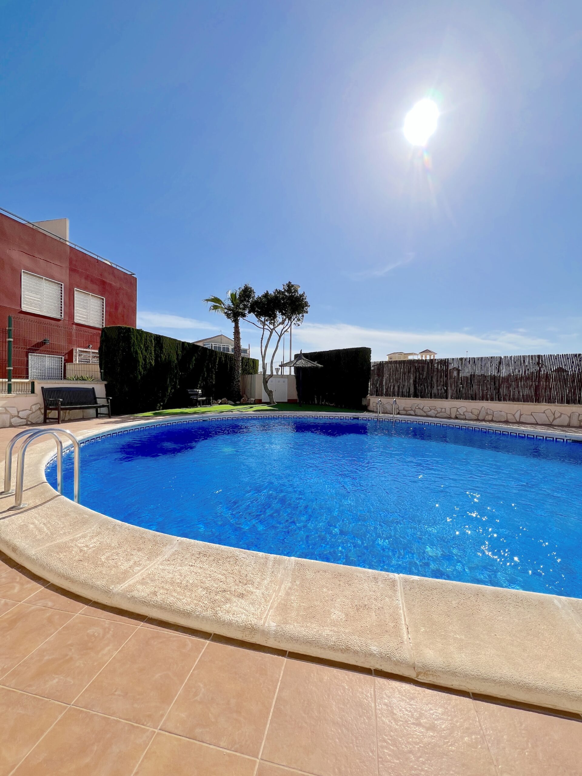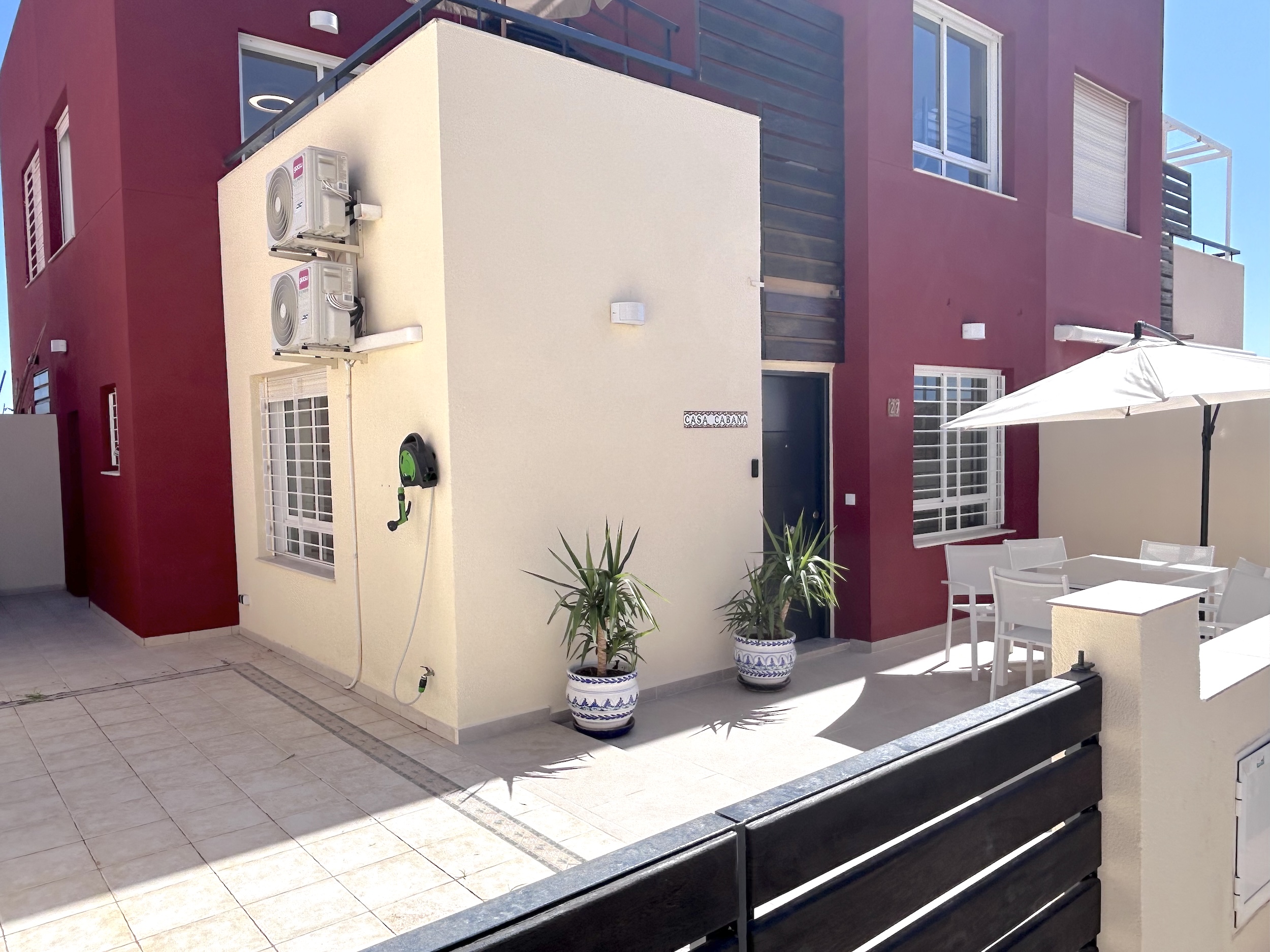The first floor has the main bathroom with large walk in shower, guest bedroom with bunk beds and the mater bedroom with a king size bed. Both bedrooms have hot and cold air conditioning. The landing also provides access to a balcony with sun loungers and a table and chairs. From here you can also have access to the large private solarium where there is a garden set and more sun loungers.