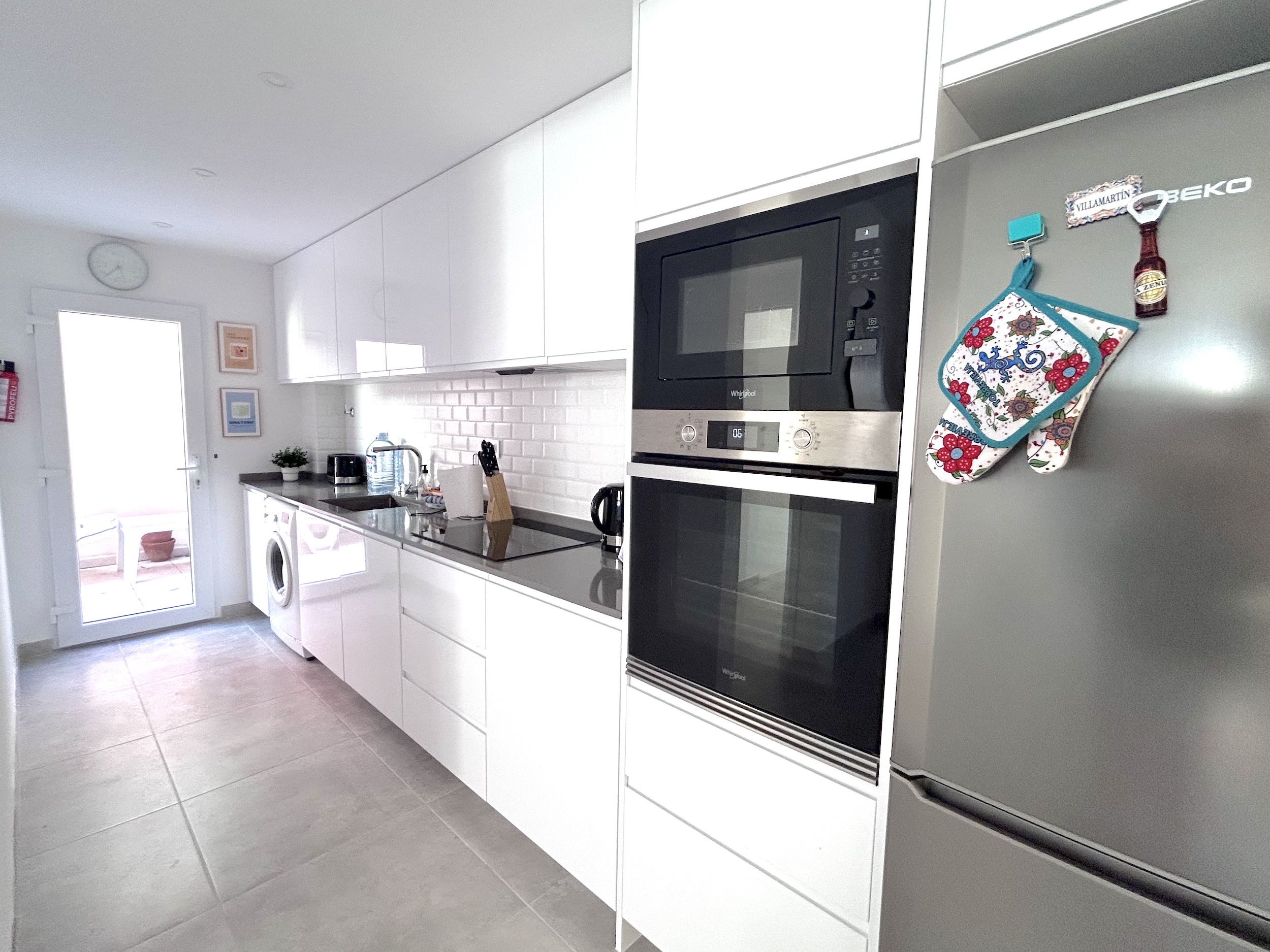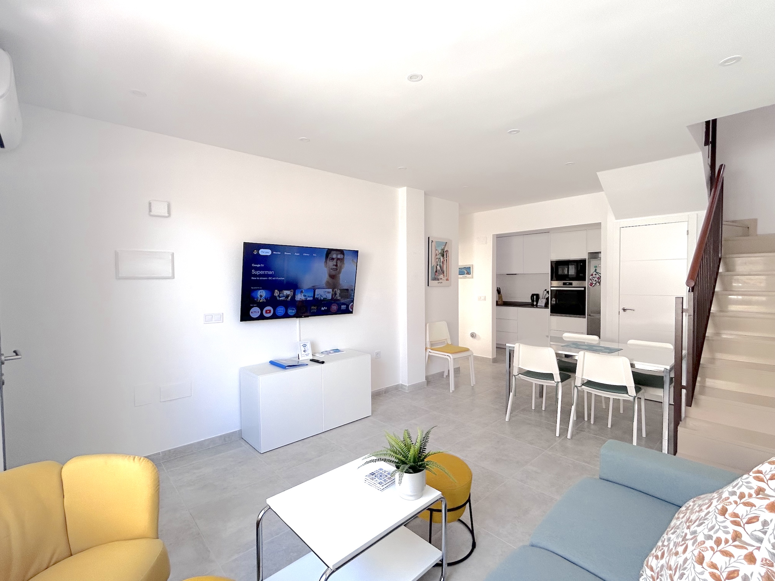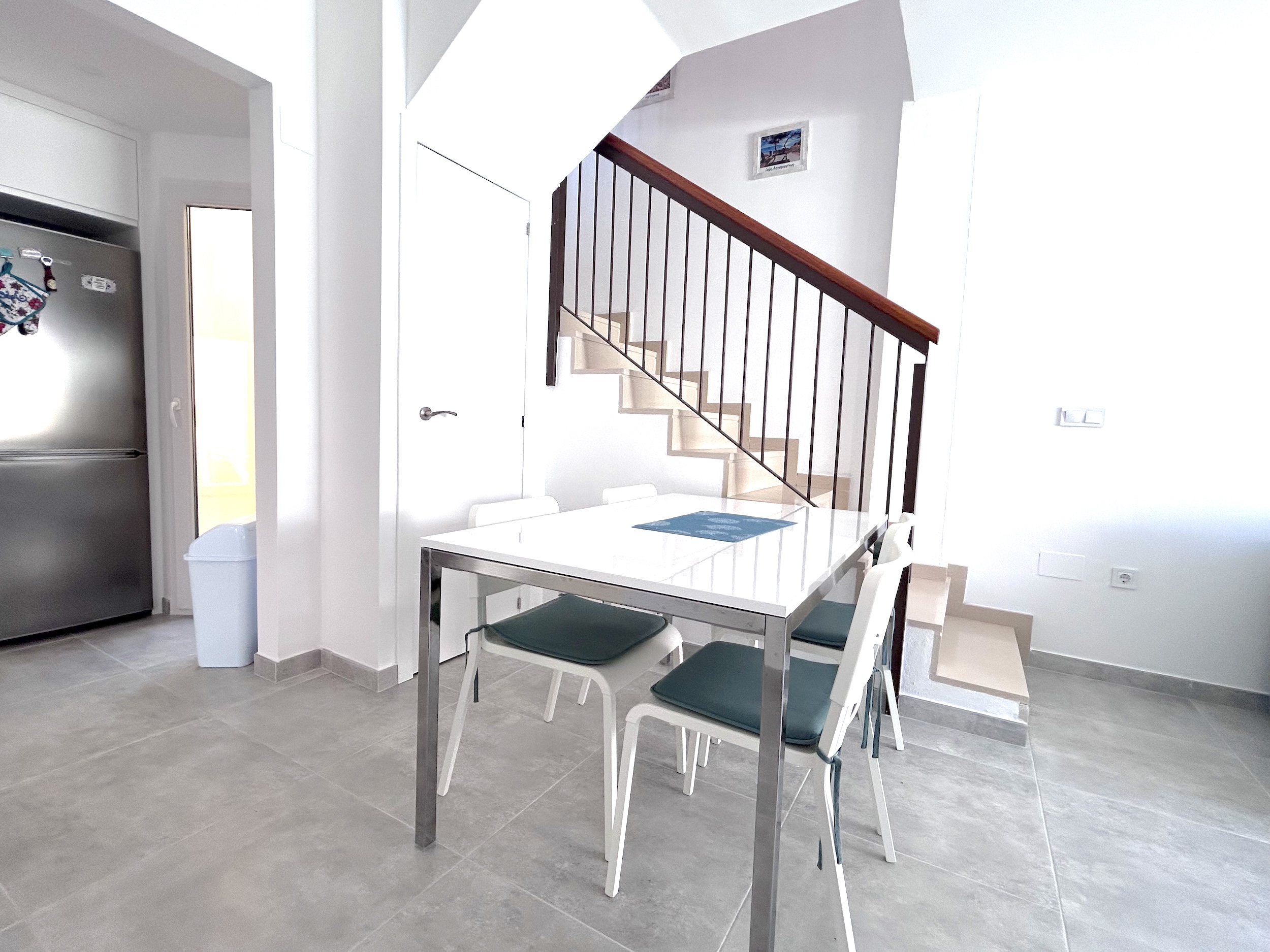 Set in a small residential complex, this quad property has lots of space for a family holiday including a fully tiled front and side garden. Inside the property the improvements made by the recent refurbishment are clear to see and you have a lovely spacious lounge area with ample seating and a large television which is connected to the internet. Towards the rear of the lounge, is the dining area and this has open access to the lovely new fitted kitchen and store room. Completing the ground floor is a bathroom with walk in shower and this is situated next to the downstairs bedroom furnished with a double bed, wardrobes and air conditioning.